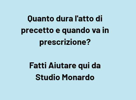 - L’atto di precetto dura 90 giorni: l’art. 481 c.p.c. prevede che il precetto perde efficacia se l’esecuzione non è iniziata entro novanta giorni dalla sua notificazione . Questo è un termine di decadenza, cioè un termine perentorio che non può essere sospeso o prorogato (salvo opposizioni), e non un termine di prescrizione del diritto.