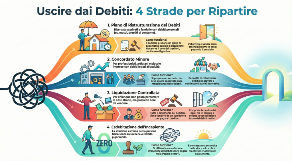 La legge sul sovraindebitamento mette a disposizione quattro percorsi principali per affrontare la crisi debitoria, riecheggiando quelli già previsti dalla L.3/2012 ma con vari adattamenti: