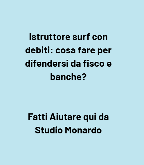 Per un istruttore di surf la passione per le onde e per l’insegnamento può andare di pari passo con un’impresa individuale o con un’attività professionale strutturata. Tuttavia, l’attuale contesto economico segnato dalla pandemia, dalle restrizioni alle attività sportive e da normative fiscali sempre più stringenti ha lasciato molti professionisti dell’outdoor con un accumulo di debiti verso il Fisco e verso le banche. Fatture insolute, contributi previdenziali non pagati, rate di mutui per l’acquisto della sede o dell’attrezzatura, canoni di locazione e imposte locali sono solo alcune delle voci che possono trasformare una passione in un incubo.