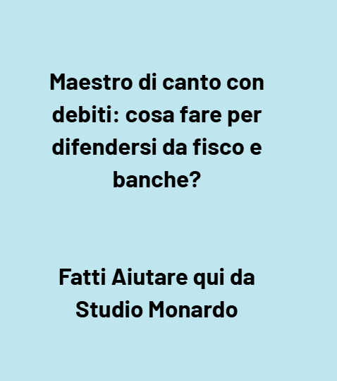 Negli ultimi anni molti liberi professionisti hanno sperimentato difficoltà finanziarie dovute alla crisi economica, alla pandemia e ai rincari energetici. Tra i più colpiti ci sono anche i maestri di canto, spesso lavoratori autonomi senza ammortizzatori sociali e con entrate irregolari. Il rischio è quello di accumulare debiti con il fisco o con la banca e di ritrovarsi improvvisamente a dover fronteggiare cartelle esattoriali, avvisi di mora, decreti ingiuntivi o persino pignoramenti che compromettono la serenità familiare e l’attività professionale.