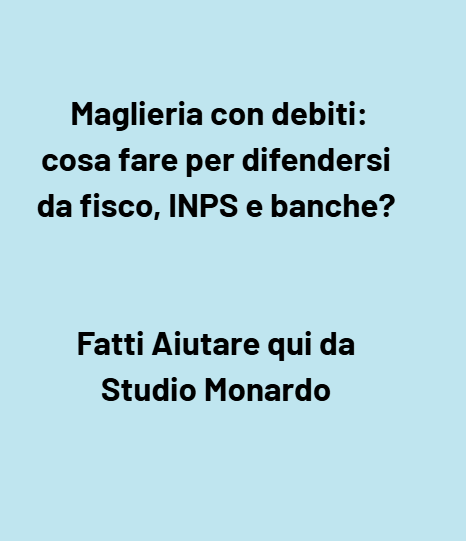 Affidarsi a un professionista esperto permette di individuare i vizi degli atti, scegliere la strategia più efficace e negoziare con le controparti con cognizione di causa. L’Avv. Giuseppe Angelo Monardo e il suo team di avvocati e commercialisti offrono un servizio completo: analisi degli atti, ricorsi, negoziazione con l’Agenzia delle Entrate, l’INPS e le banche, predisposizione di piani di rientro e assistenza nelle procedure di sovraindebitamento. Grazie all’esperienza maturata in tutta Italia e alla qualifica di cassazionista, gestore della crisi da sovraindebitamento, fiduciario di un OCC ed esperto negoziatore della crisi d’impresa , lo studio è in grado di tutelare efficacemente imprese artigianali come le maglierie.