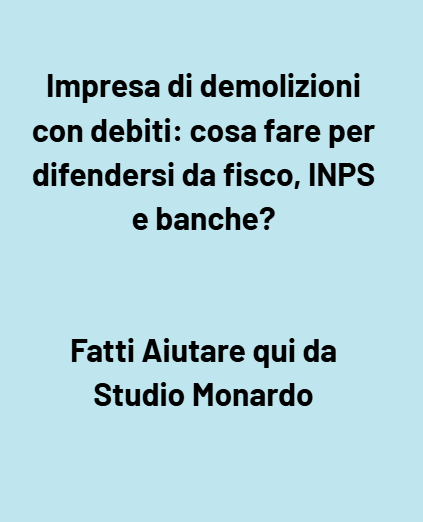 Gestire un’impresa di demolizioni comporta obblighi complessi e responsabilità importanti verso il fisco, l’INPS e le banche. L’attività è inserita in un settore ad alto impatto ambientale, dove gli adempimenti fiscali, contributivi e ambientali sono numerosi e dove i flussi finanziari sono spesso esposti a oscillazioni di mercato. Può accadere che, a causa di fattori esterni (ritardi nei pagamenti dei committenti, crisi di liquidità o errori gestionali), l’azienda accumuli debiti nei confronti dell’Agenzia delle Entrate, dell’INPS o degli istituti bancari. In assenza di interventi tempestivi, questi debiti possono sfociare in cartelle esattoriali, intimazioni di pagamento, iscrizioni ipotecarie, pignoramenti o addirittura nella chiusura dell’attività.