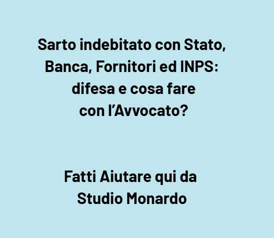 Se siete un sarto o un imprenditore indebitato e volete capire quali sono le vostre possibilità, contattate subito, in fondo all’articolo, l’Avv. Giuseppe Angelo Monardo per una valutazione legale personalizzata. Alla fine di questo articolo troverete indicazioni utili su come farlo.