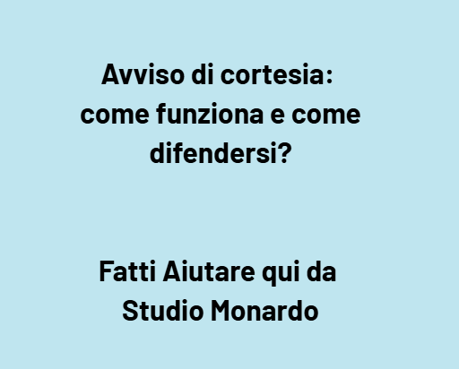 - Attenzione ai termini legali: a volte l’avviso di cortesia segnala ad esempio un preavviso di fermo o un’intimazione, i cui termini per richiedere delibazione sono brevissimi (p.es. 20 giorni per il fermo). Non perdere tempo: rivolgersi subito ad un avvocato evita di incorrere in decadenze tecniche.