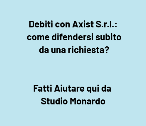 - È vero che una semplice telefonata è già un atto legale? No. Una telefonata, un’email o una lettera commerciale non hanno valore esecutivo di per sé. Axist può contattarti, ma per procedere legalmente dovrà passare dal tribunale (decreto ingiuntivo e precetto) o dalle vie legali fiscali (cartella esattoriale).