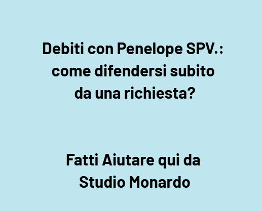 INTRODUZIONE – Ricevere una diffida o un sollecito di pagamento da parte di Penelope SPV può cogliere un debitore impreparato e generare ansia: molte persone non sanno che dietro a queste richieste c’è in realtà una procedura finanziaria complessa e regolamentata. Il rischio è di cadere in errori costosi – per esempio, pagare senza verificare la validità del debito o degli importi richiesti – e di subire conseguenze gravi come pignoramenti o ipoteche. In questo articolo spieghiamo perché è importante agire subito, quali sono gli strumenti giuridici a disposizione del debitore e come evitarne gli errori. Si affronteranno soluzioni legali concrete: dall’impugnazione dell’atto ricevuto al ricorso giudiziario o all’ottenimento di sospensioni, fino alla contrattazione di piani di rientro del debito (saldo e stralcio, definizioni agevolate, piani del consumatore, esdebitazione, ecc.).